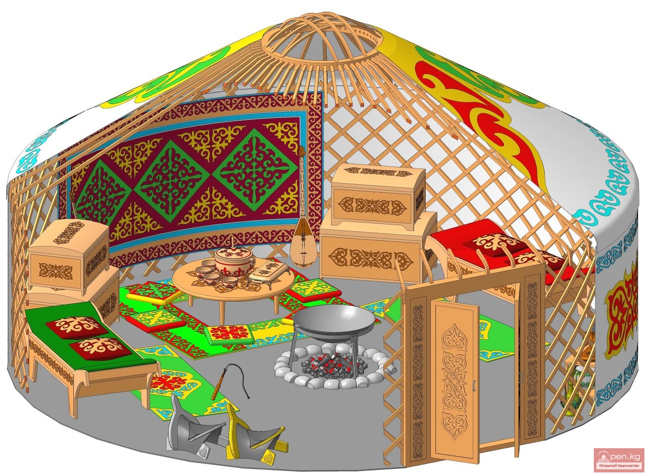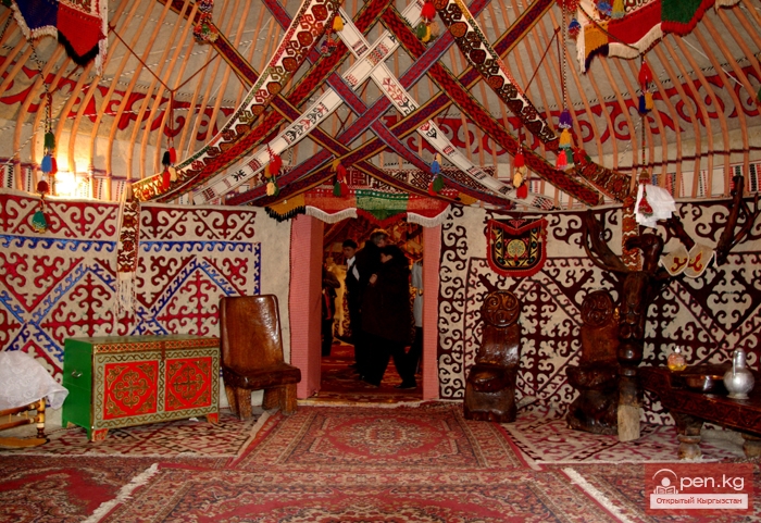 Легкость и изящество, по словам Ч. Валиханова, придавала киргизской юрте резная дверь. Но в основном интерьер жилища отличался простотой и бедностью. Посередине юрты устраивался очаг, справа от двери проходила перегородка из чия, отделявшая женскую половину жилища от мужской. Здесь находились железные котлы, деревянные ковши и чашки, бурдюки, которыми киргизы пользовались в обиходе. На левой, мужской половине, хранили седла, сбрую, ружья. Пол в юрте застилали кошмами, поверх которых лежали шкуры домашних или диких животных. На почетном месте, у задней стены, расстилали войлочный ковер. Для освещения юрты пользовались чугунными или глиняными светильниками.