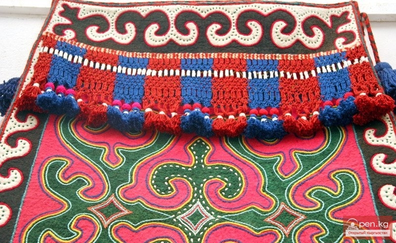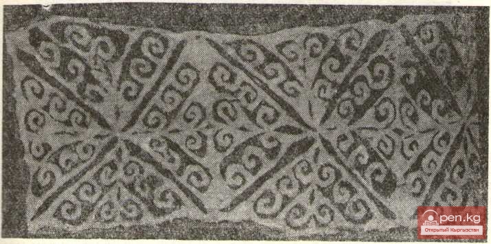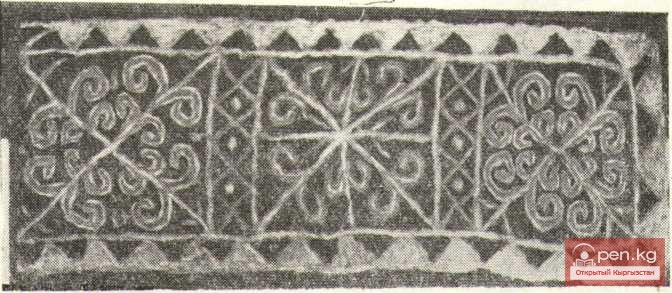 Таким образом, центральное поле на войлочном киргизском ковре с вкатанным узором имеет в основном геометрическое построение в виде ромбов, квадратов, прямоугольников, треугольников, в которые вводится узор. Здесь как бы заложены основные характерные черты киргизского прикладного искусства, которые выявляются и в других войлочных изделиях, а также в плетении, ткачестве и в вышивке. Округлость форм в построении центрального поля, наблюдаемая в узбекских войлоках, киргизам несвойственна.