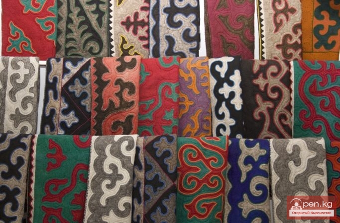 В войлочном ковре непременно имеется орнаментированная кайма шириной в среднем 25—30 см. Ее украшают однородными узорами, иногда построенными по принципу позитива и негатива. Узор каймы разнообразен, но всегда в ней строго ритмично повторяются мотивы плавно округленных контуров. Самыми распространенными является «кыял», «кочкорок», «карга тырмак, «сыцар муйуз», «куш» — хищная птица.