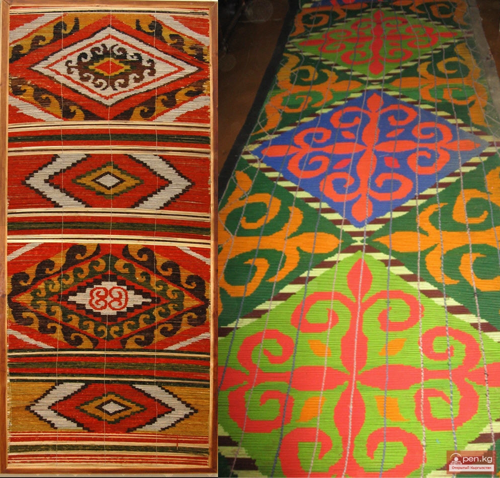 Циновки, служащие для обтягивания остова юрты, для навешивания на дверь и для ширмы, в прошлом делали узорными. Чаще употреблялись узорные ширмы. Что касается первых двух, то они являлись достоянием лишь богатых и на юге Киргизии почти не сохранились.