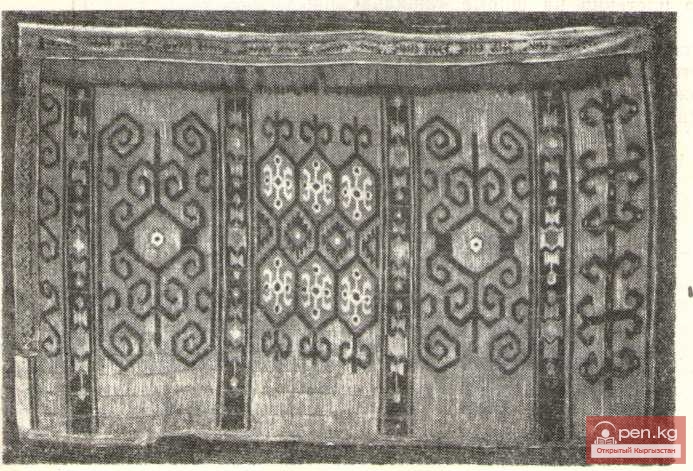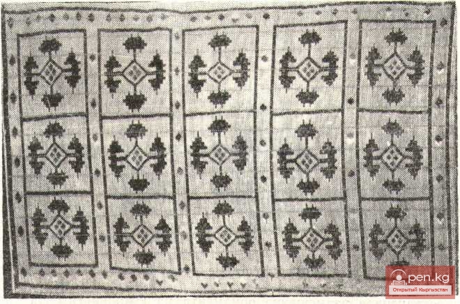 Таким образом, мы можем говорить о локальных вариантах узорного плетения на ширме «ашкана чий». Чрезвычайно интересно, что там, где ковровое производство у киргизов не получило развития, ширму делали коврового типа, и наоборот. Это свидетельствует о тесных связях в прошлом между северными и южными киргизами. Ковровая композиция на ширме является подражанием композиции ворсового ковра.