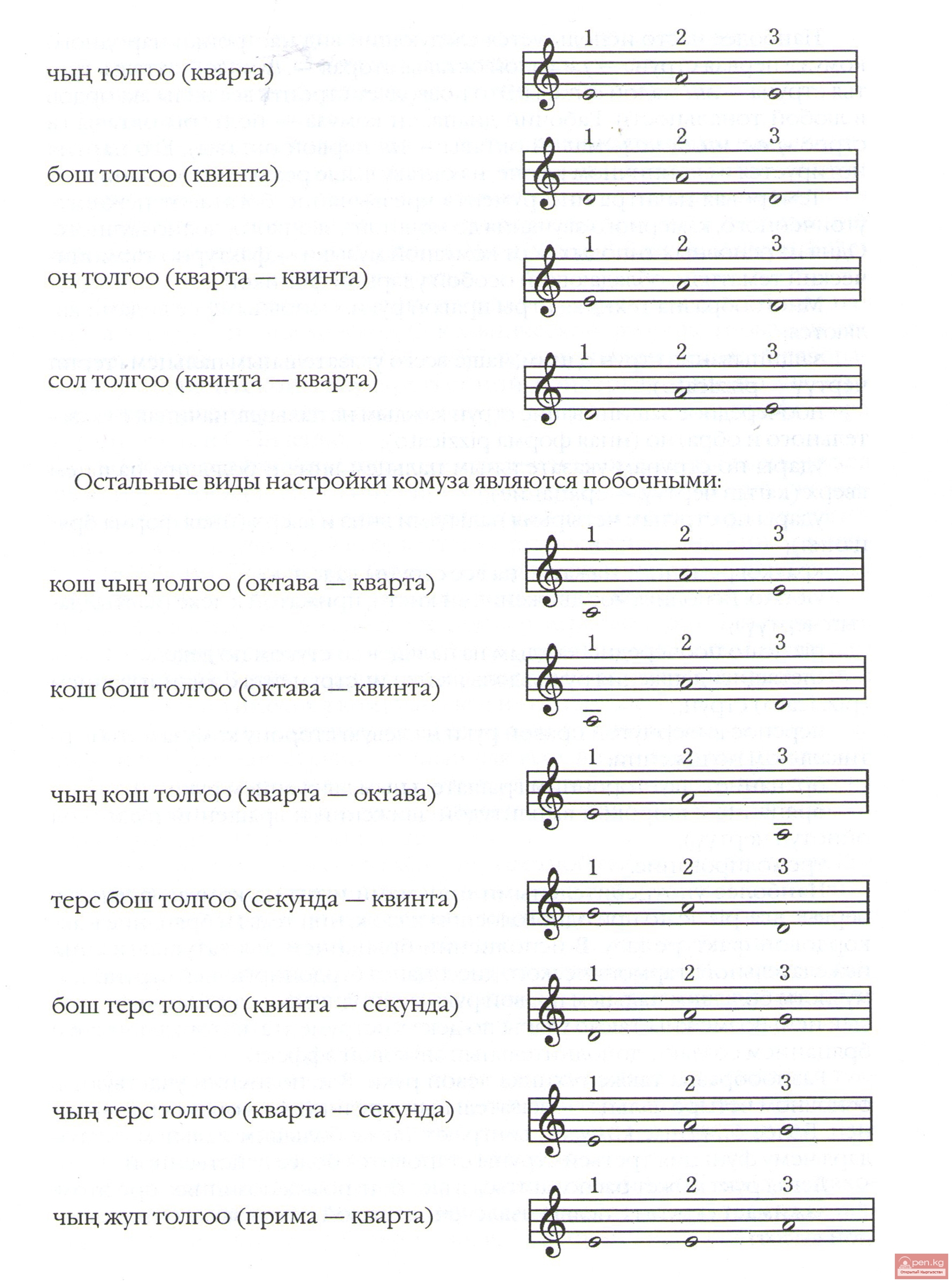 Одним из уникальных свойств кыргызского народного комуза является многообразие видов его настройки, так или иначе связанных с интонационными, гармоническими и жанровыми особенностями пьес. А. Затаевич зафиксировал шесть ее видов. В современной комузной практике количество их доведено до одиннадцати. Каждый вид имеет свое традиционное название. Однако виды настройки неравноценны по частоте их применения. В зависимости от распространенности того или иного строя установились две категории комузной настройки: главная и побочная. К главным видам настройки относятся: