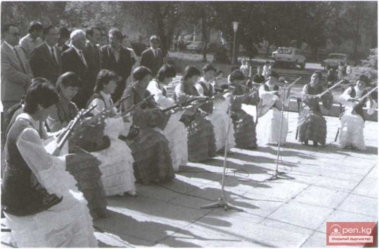 Старейший в республике оркестр кыргызских народных инструментов создан в 1936 г. при Кыргосфилармонии им. Т. Сатылганова, он носит имя выдающегося комузчу Карамолдо Орозова. Кроме него, подобные оркестры имеются в Кыргызской национальной консерватории, Кыргызском государственном институте искусств им. Б. Бейшеналиевой, Ошской областной филармонии им. Р. Абдыкадырова («Насыйкат»), Кыргызском государственном музыкальном училище им. М. Куренкеева, Ошском музыкальном училище им. Ниязаалы. В них включены, помимо народных, симфонические инструменты, в связи с чем их состав можно квалифицировать как народно-симфонический или кыргызско-европейский. Репертуар оркестров смешанный: национальные и инонациональные народные и авторские произведения, оригинальные или в переложении и обработке. Методика исполнения — нотная, руководство дирижера обязательно. Все коллективы состоят из профессиональных музыкантов.
