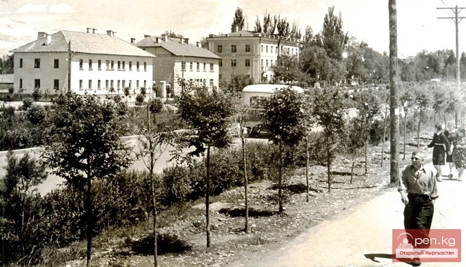 Первые двух- и трехэтажные здания появились в конце 30-х годов. Это были 10-летняя школа №4 и здание школы торговых работников Киргизпотребсоюза. В послевоенное время построен ряд жилых административных и общественных зданий, главным образом на южной стороне улицы. Возведены баня, па месте артели "Пищевкус" поднялся корпус бисквитной фабрики, а рядом, на углу Советской ул. - трехэтажное здание швейной фабрики - "1 мая". На углу проспекта Дзержинского выросло многоэтажное административное здание КГБ Киргизской ССР, протянувшееся на целый квартал до ул. Первомайской. Далее пятиэтажное здание "Киргизглавэнерго", многоэтажный жилой дом, двухэтажные здания Первомайского райкома партии, продовольственного магазина, министерства социального обеспечения и другие.