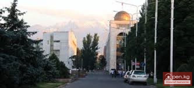 Гармонично вписалось в пейзаж улицы современное здание Киргизского государственного ордена Трудового Красного Знамени академического драматического театра (архитекторы Ф. М. и М. Г. Евсеевы).