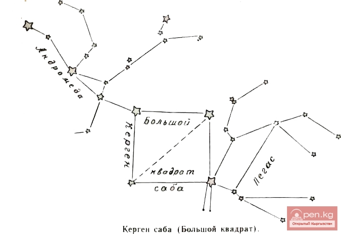 Большой квадрат, относящийся к двум созвездиям — созвездию Пегас и созвездию Андромеды, киргизы называли Керген саба (букв, натянутый кожаный бурдюк, в котором приготавливают кумыс). По их наблюдениям, эти четыре звезды — весной не видны, осенью видны в зените, а зимой появляются на западной стороне неба.