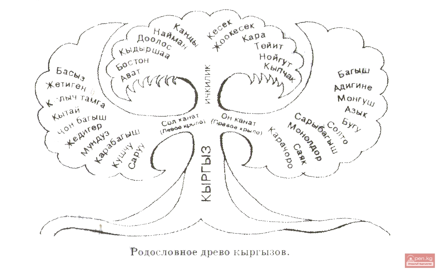Таким образом, кыргызы, ныне живущие в стране, а также за ее пределами, ведут свое происхождение от общих предков и состоят из трех больших групп: правое крыло (он), левое крыло (сол) и группы ичкилик.