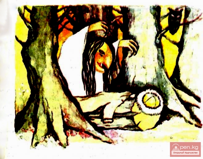 — Друг мой Эдил, расскажи нам что-нибудь забавное, да только выбери самый интересный случай,— попросил Адыл- мерген. — Хорошо, мой друг, расскажу, только должен признаться, что я еще не совершил никакого подвига и в охотничьей жизни своей ничего сверхдивного не встречал. Правда, однажды случилось такое, что до сих пор не могу опомниться,— начал свой рассказ Эдил-мерген. — А было так... Вышел я как-то на охоту один. Весь день проходил по горам, ничего путного не встретил и очень расстроился: такое случилось со мной впервые. Чтобы, не возвращаться в аил с пустыми руками, я углубился в чащу леса в надежде подстрелить хотя бы косулю. Но и тут меня ждала неудача. Скука одолела меня и начала клонить ко сну, я стал засыпать сидя на коне. Вдруг я проснулся от звонкого смеха: передо мной стояли красивая молодка и лукавая девушка. Они собирались доить кобылиц. Я очень удивился: на этом месте никогда не было аила, никто никогда не пас здесь табун. — Ну, охотник, где твоя ширалга?— улыбнулась девушка. — Будет добыча — будет и подарок — ответил я. — Такой джигит, как вы, должен добыть ее в любом случае,— вскинула бровью молодка, — Заходите в юрту, отведайте кумыса,— пригласила она.