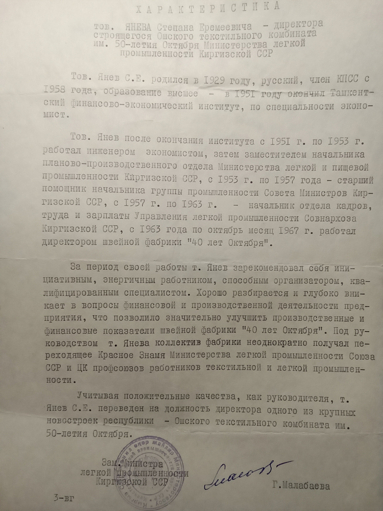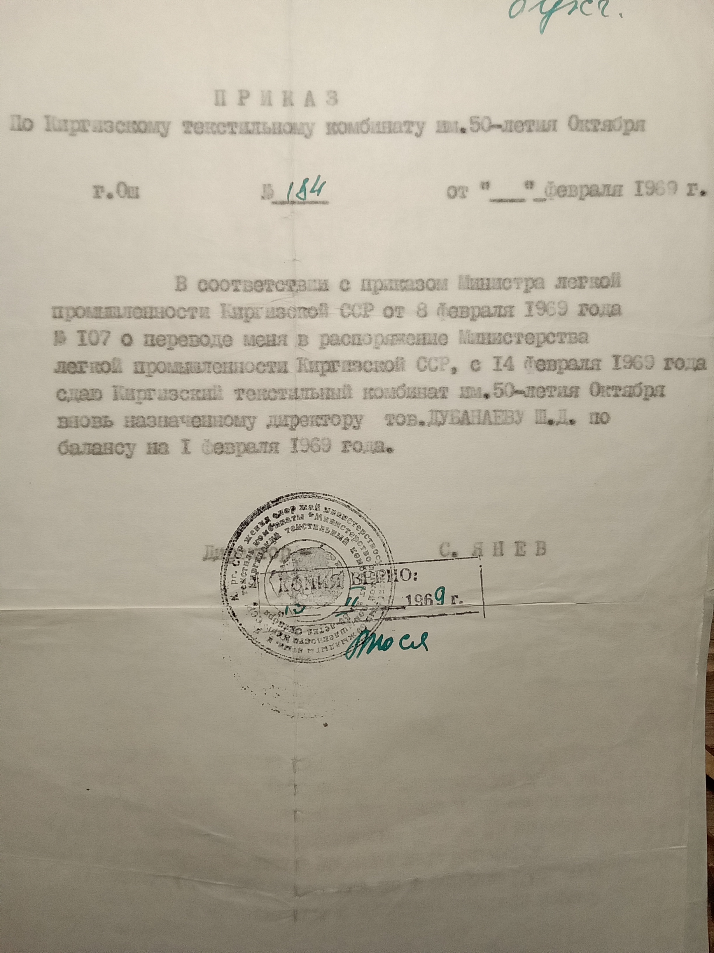 Работники и фабрики 40 лет Октября и Ошского ХБК любили своего директора, он поддерживал с ними отношения и после перевода на другую работу.