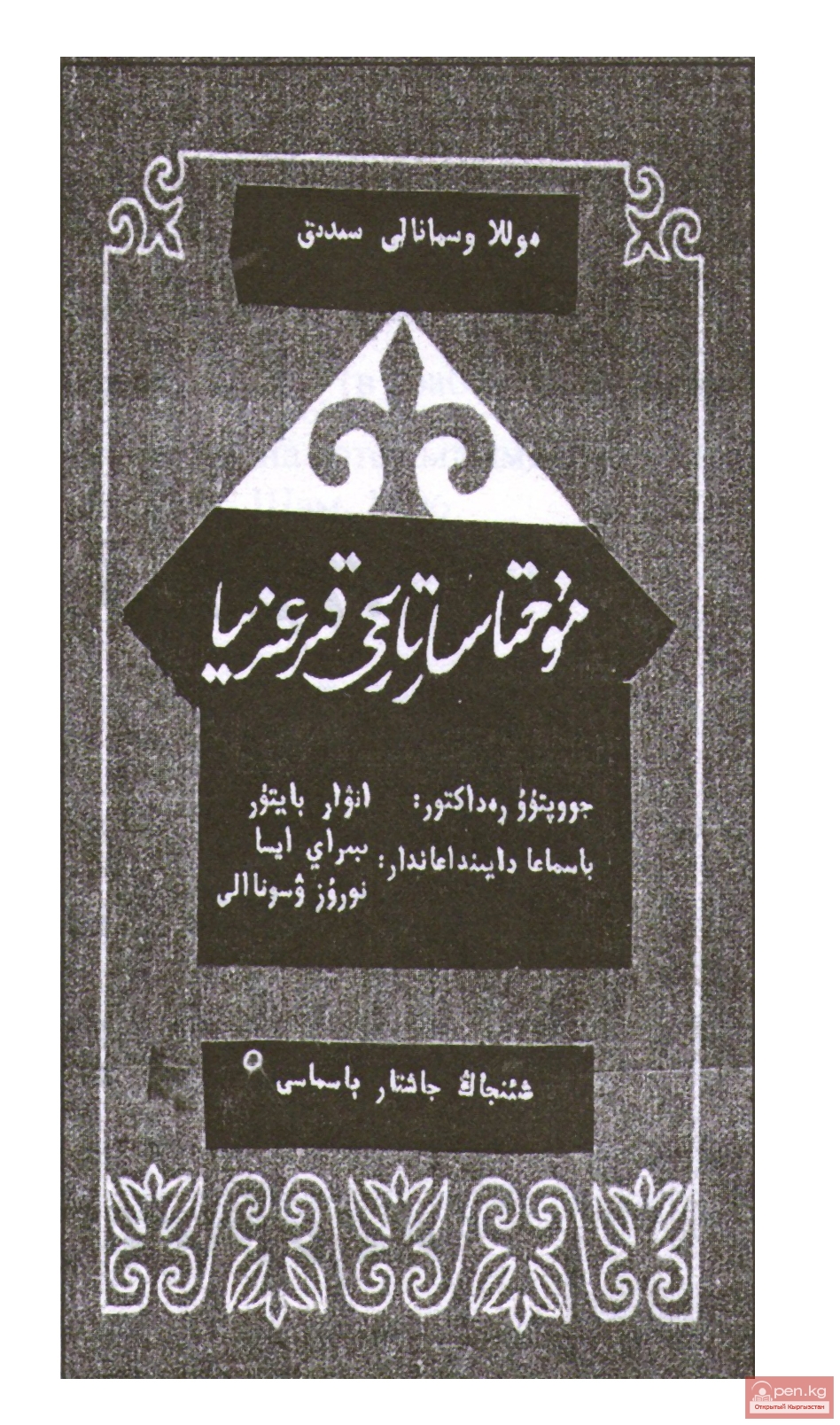 Титульный лист книги О. Сыдык уулу «Краткий свод Кыргызской истории», изданной в 1986 г. в г. Урумчи в арабской графике под редакцией Анвара Байтура. В данной книге были переизданы две работы О. Сыдык уулу - «Мухтасар тарых-и кыргызийа» (1913) и «Тарых-и кыргыз шадманийа» (1915), изданные в Уфе.