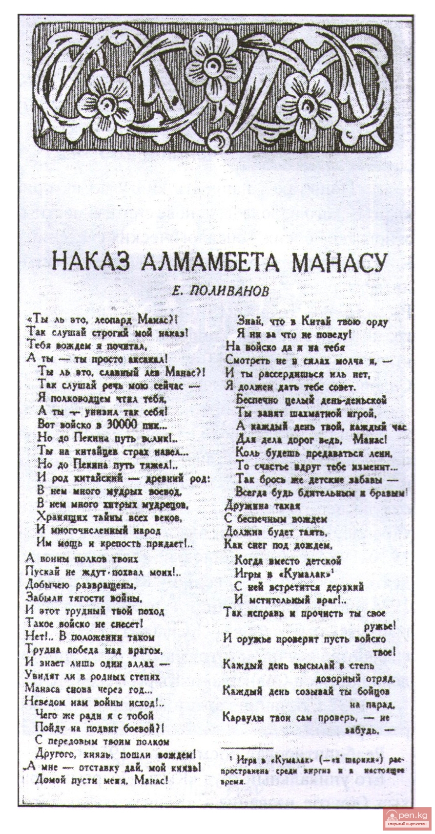 Фото страницы журнала «Литературный Узбекистан», 1935, №2, г.Ташкент. Фрагмент перевода отрывка эпоса «Манас», великолепно выполненного Е.Д. Поливановым