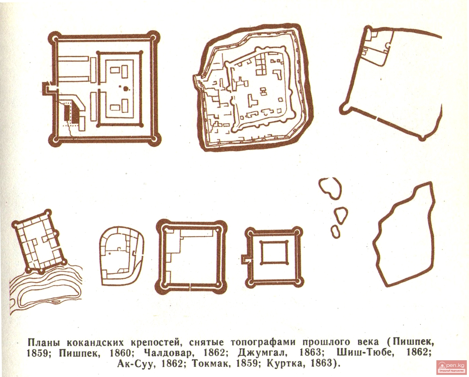 Сохранилось несколько описаний, рисунков и чертежей крепости Пишпек — до и после взятия ее совместными усилиями киргизских повстанцев и русских войск. Описывая крепость, один из современников отмечал, что она обнесена двойной стеной. Внутренняя стена выше наружной и до того широка, что по гребню ее, как уверяли, может проехать телега.