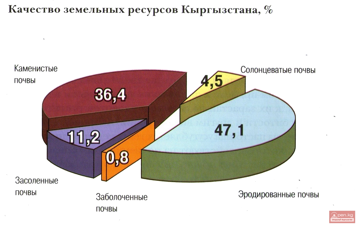 Основные проблемы загрязнения земельных ресурсов Кыргызстана — снижение плодородия почвы вследствие прогрессирующего засоления и осолонцевания, переувлажнение и заболачивание земель, ветровая и водная эрозии, засоренность камнями, деградация пастбищных земель. В результате выноса эрозией и отсутствия внесения необходимых дозорганических удобрений вынос гумуса растениями из пахотного горизонта составил от 20 до 45%, а его содержание в почве в настоящее время не превышает 2,5%. В этих условиях урожайность сельскохозяйственных культур прямо зависит от количества вносимых минеральных удобрений.