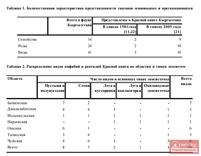 Герпетофауна Кыргызстана является в целом обеднённой, что объясняется физико-климатическими особенностями территории, значительную часть которой занимают высокие горы с суровым климатом, и образом жизни земноводных и пресмыкающихся, являющихся наиболее теплолюбивыми животными из классов позвоночных животных. Так, в мире известно почти 5000 видов земноводных, в то время как в республике встречаются всего четыре вида, один из которых (озёрная лягушка, «сборный» видRana ridibunda (Pallas, 1771), по-видимому, проник сюда с северо-запада вместе с человеком. Количество ныне живущих на планете видов рептилий достигает, по различным оценкам, 7350–7800, в Средней Азии их известно не менее 90 видов, в Кыргызстане – 37. Несмотря на это сравнительно небольшое число, не следует его считать окончательным. Во-первых, в последние десятилетия система рептилий интенсивно исследуется, в частности, с применением кариологических и молекулярно-генетических методов, и частота, с которой ревизуются ранги таксонов, ещё не начала уменьшаться. Во-вторых, среди пресмыкающихся республики также есть инвазивный вид (туркестанский геккон Cyrtopodion fedtschenkoi (Strauch, 1887)), и не исключено вселение некоторых других видов на территорию Кыргызстана в будущем. В первой сводке по рептилиям Кыргызстана число достоверно зарегистрированных в республике видов непревышало 30. Исследование герпетофауны Кыргызстана продолжается, несмотря на очевидные трудности, с которыми столкнулась отечественная герпетология в последние десятилетия (дефицит современной литературы, кризис экспедиционного бюджета, отсутствие серпентария, оборудования и т. п.).