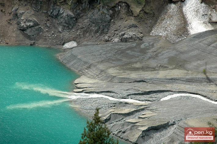 Озеро Кара-Суу - завального происхождения. С правой, северной, стороны горы отчетливо видно место, откуда оторвалась часть ее и, свалившись вниз, перекрыла русло речки Карасу.