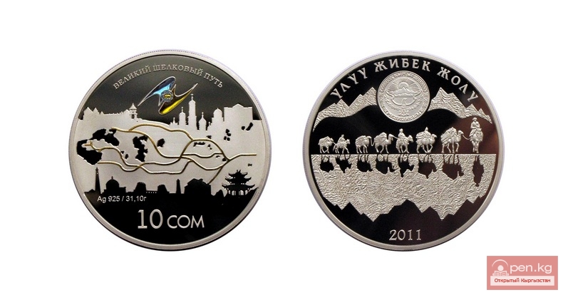 С 20 декабря 2011 года Национальным банком Кыргызской Республики в рамках Международной программы стран ЕврАзЭС по выпуску и реализации коллекционных монет из драгоценных металлов введена в обращение коллекционная серебряная монета «Великий шелковый путь» номиналом 10 сом.