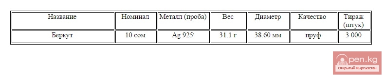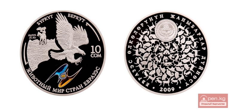 С 29 октября 2009 года Национальным банком Кыргызской Республики введена в обращение коллекционная серебряная монета "Беркут" серии "Животный мир стран ЕврАзЭС" номиналом 10 сом.