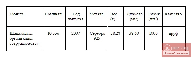 Со 2 апреля 2007 года Национальным банком Кыргызской Республики введена в обращение коллекционная монета " ШОС", посвященная Шанхайской организации сотрудничества.