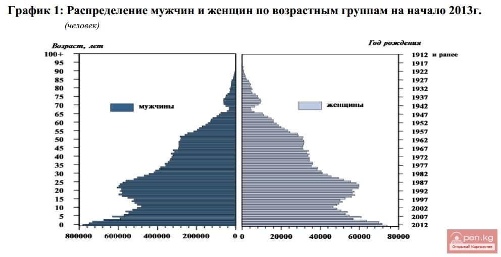 В половозрастной структуре населения Кыргызстана по-прежнему имеются различия в изменениях возрастных групп населения. Так, в группе моложе трудоспособного возраста (1 млн. 845 тыс. человек на начало 2013г.) отмечается некоторое сокращение, происходящее из-за снижения рождаемости в 1990-х годах.
