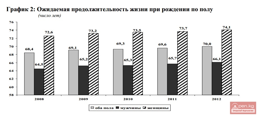 Более высокий, по сравнению с наиболее развитыми в экономическом отношении странами мира, уровень смертности населения Кыргызстана отрицательно сказывается на размере показателя ожидаемой продолжительности жизни при рождении – 70 лет для обоих полов в 2012г. Ожидаемая продолжительность жизни у мужчин на 8 лет ниже, чем у женщин.