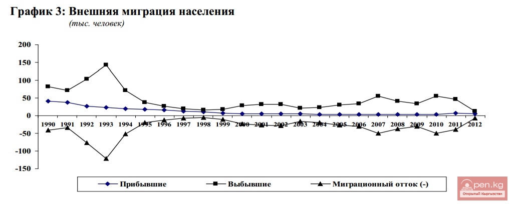 Возможно, данная ситуация объясняется прекращением действия двухстороннего межправительственного соглашения по упрощенному приобретению гражданства между Кыргызстаном и Россией (куда направлялась большая часть эмигрантов). Отрицательный миграционный баланс отмечался со всеми странами СНГ, за исключением Таджикистана и Туркменистана. Основные страны эмиграции населения Кыргызстана – Россия и Казахстан.