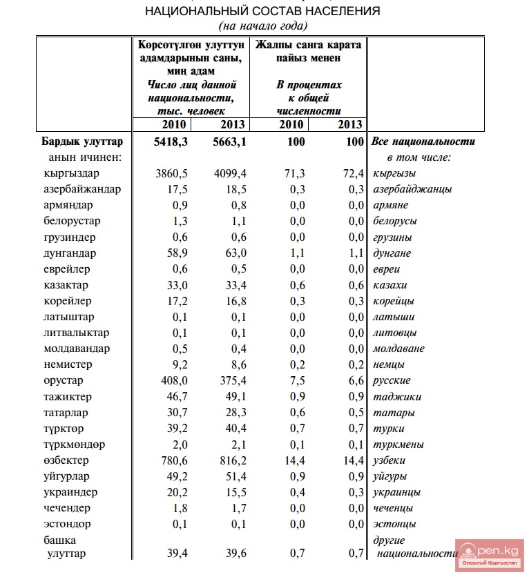 Всего в стране проживает более 100 национальностей, наиболее многочисленные из них (по данным на начало 2013г.) кыргызы – 4 млн. 99 тыс. человек (72 процента в общей численности населения), узбеки – 816 тыс. человек (14 процентов) и русские – 375 тыс. человек (около 7 процентов). Численность дунган составила 63 тыс. человек (1 процент), все остальные национальности - менее 1 процента, составившие в общей сумме около 6 процентов населения страны.