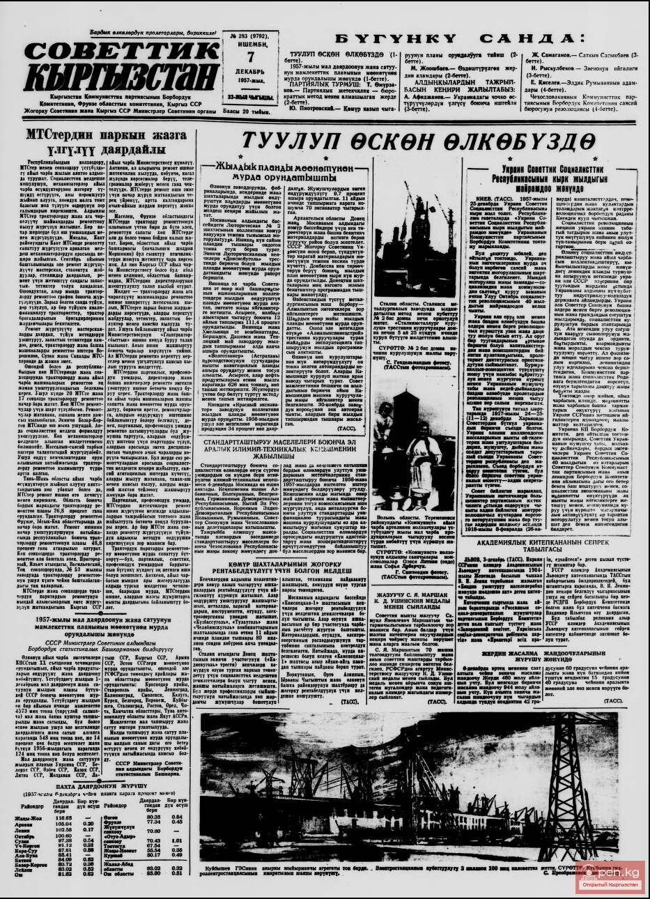 Все это говорит о том, что в республике в эти годы быстрыми темпами развивались печать и книгоиздательское дело. К концу 1936 года издавались семь республиканских, 38 районных газет и три журнала общим разовым тиражом около 160 тысяч экземпляров. За десять лет (1926-1936 гг.) в Киргосиздате вышло 1356 названий книг общим тиражом более 7 миллионов экземпляров. Особое внимание уделялось изданию литературы на кыргызском языке. Например, из 270 книг, вышедших в 1937 году, 204 были на кыргызском языке.