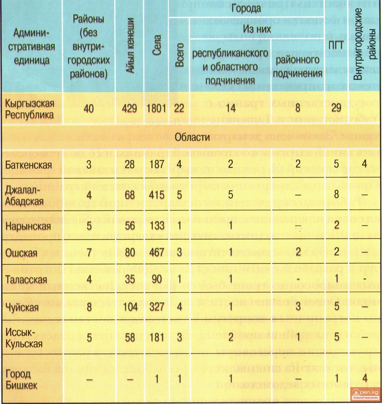 С 1991 года, после получения независимости, Кыргызская ССР переименована в Кыргызскую Республику, которая состоит из семи областей: Баткенская, Джалал-Абадская, Иссык-Кульская, Нарынская, Ошская, Таласская, Чуйская и столицы года Бишкек. Каждая область включает в свой состав районы и города областного подчинения, в районы входят города районного подчинения, поселки городского типа и айыл кенеши, которые, в свою очередь, объединяют сельские населенные пункты.