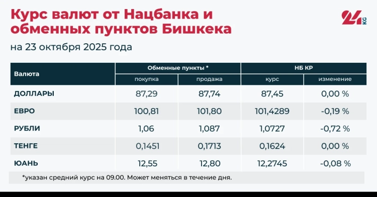 На основании информации от Национального банка Кыргызстана, а также обменных пунктов Бишкека, было зафиксировано снижение официальных курсов евро, российского рубля и китайского юаня. Доллар США и казахский тенге, в свою очередь, сохранили свою стабильность.