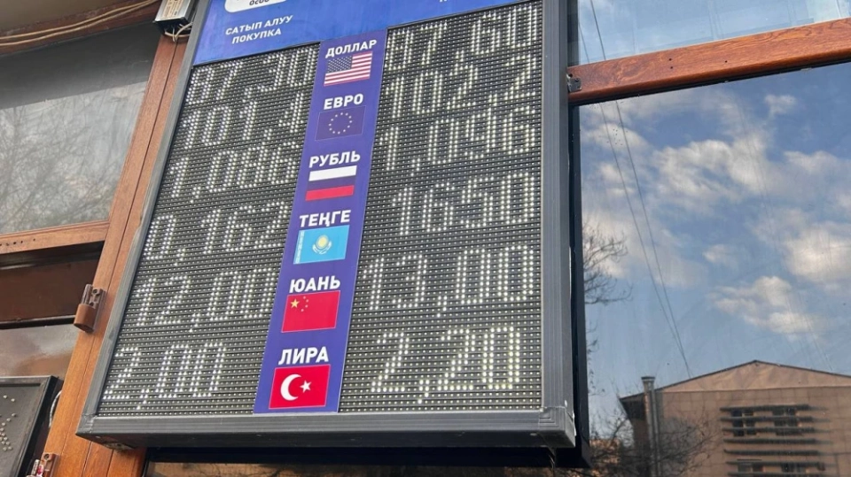 Рубль также показал снижение: его стоимость составляет 1,07-1,08 сома при покупке и 1,08-1,09 при продаже.