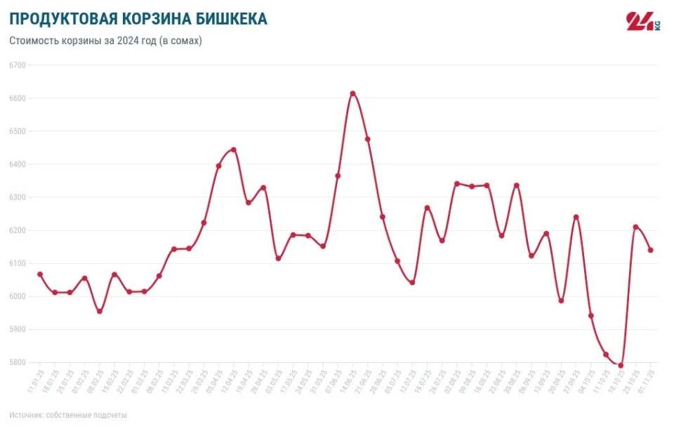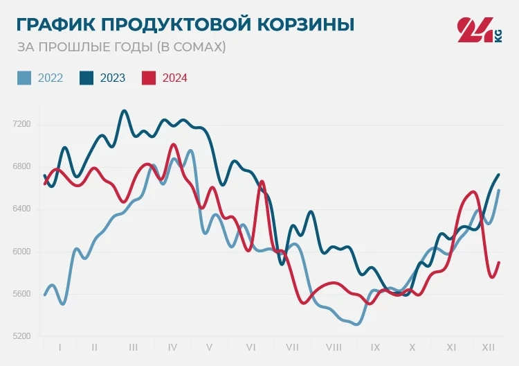 В 2024 году стоимость продуктовой корзины снизилась на 743 сома. Самая низкая цена была зафиксирована 14 сентября — 5 тысяч 510 сомов, а максимальная — 13 апреля — 7 тысяч 18 сомов.