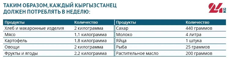 В 2009 году правительство Кыргызстана утвердило нормы питания для граждан. Согласно этому документу, каждый житель страны должен ежемесячно потреблять девять видов продуктов.