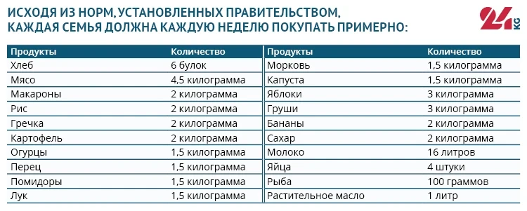 Разумеется, расчеты ориентировочные и базируются на утвержденных государством нормах. Учитывая различные предпочтения в питании, не все люди потребляют одни и те же продукты в одинаковых количествах. Некоторые вообще не едят мясо, а кто-то избегает сахара. Таким образом, к нашему эксперименту стоит относиться как к социальному исследованию 24.kg.