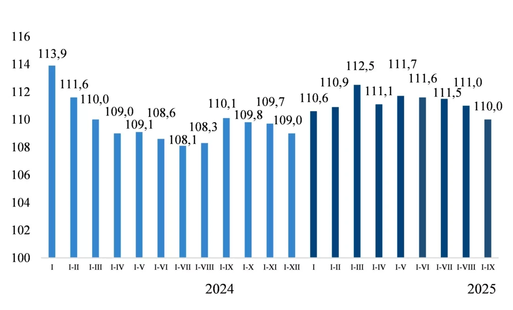 В период с января по сентябрь текущего года, по сравнению с декабрем предыдущего года, общий прирост потребительских цен и тарифов по республике составил 5,5%. Цены на продукты питания и безалкогольные напитки увеличились на 6,4%, алкоголь и табачные изделия — на 5,1%, непродовольственные товары — на 3,3%, а тарифы на услуги для населения — на 6,3%.