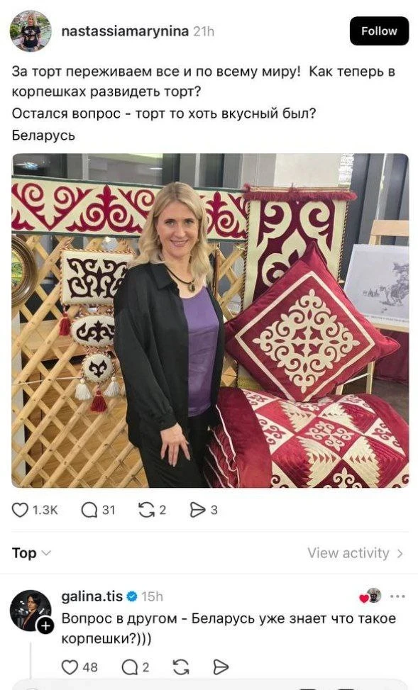 9 августа Нуршат Акбергенова в своем посте на Threads обвинила известного блогера в том, что она не заплатила за торт, сделанный на её день рождения. Кондитер сообщила, что потратила на ингредиенты 440 тыс. тенге (примерно 71,6 тыс. сомов) и указала, что вес торта составил 18 кг.