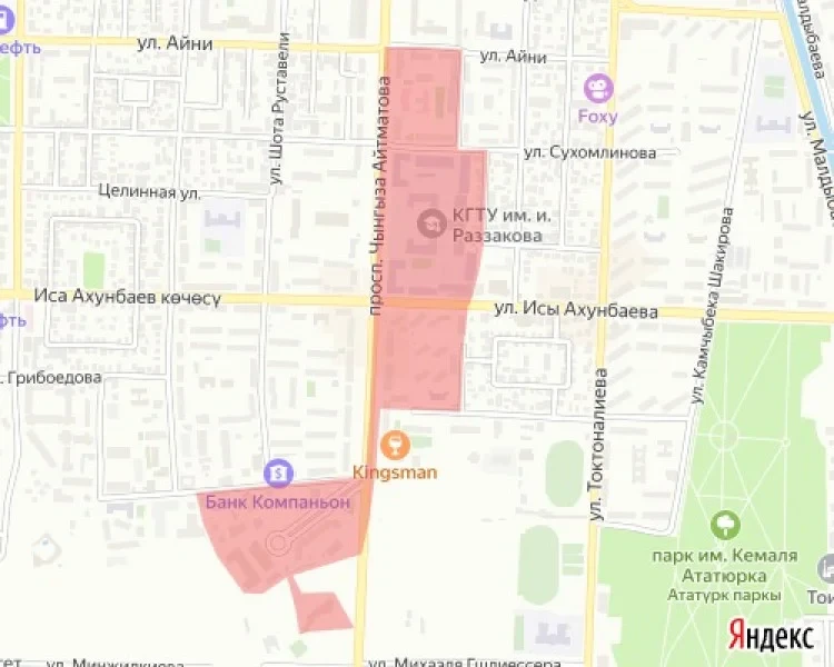 - проспект Ч. Айтматова – улица Айни – улица Водопроводная – улица Сухомлинова – улица Водопроводная – улица Целинная – Политехническая – улица Таш-Кумырская;