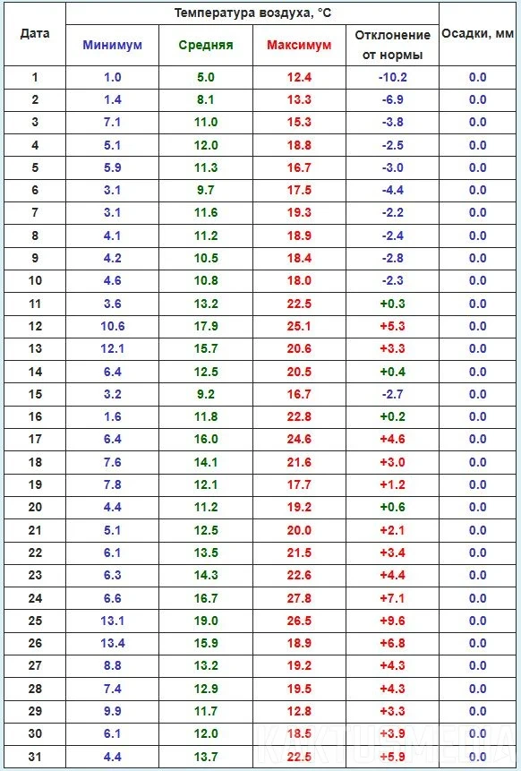 Среднемесячная температура октября составила +11,6 °C, а фактическое значение в 2025 году — +12,6 °C, что на +1 °C превышает норму.Норма осадков в октябре составляет 37 мм, но осадки не наблюдались, составив 0% от нормы.