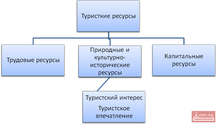 Это означает, что для развития туризма необходимы не только капитал, технологии и кадры, но, прежде всего, необходимо выбрать место, где имеются туристско-рекреационные ресурсы, а если такого места нет, то создать его. Кыргызстан обладает значительными ресурсами туризма и эта особенность позволяет утверждать, что четвертая составляющая туристского бизнеса - туристские ресурсы - является в Кыргызстане наиболее доступной, дешевой и определяет в целом его высокую рентабельность.