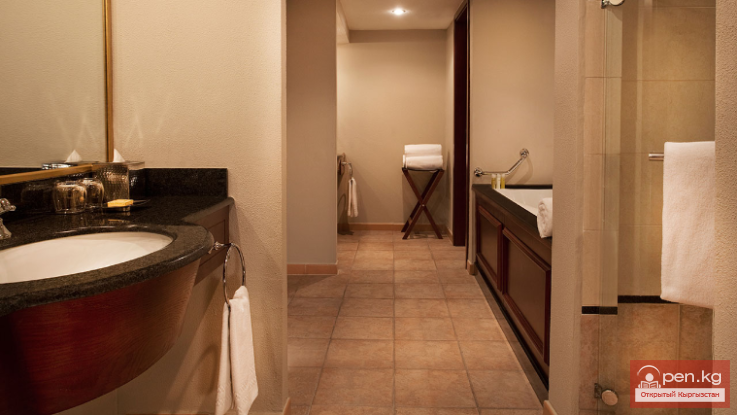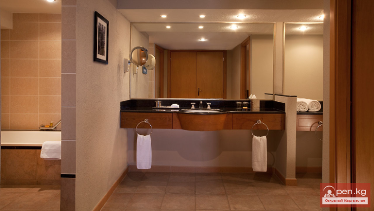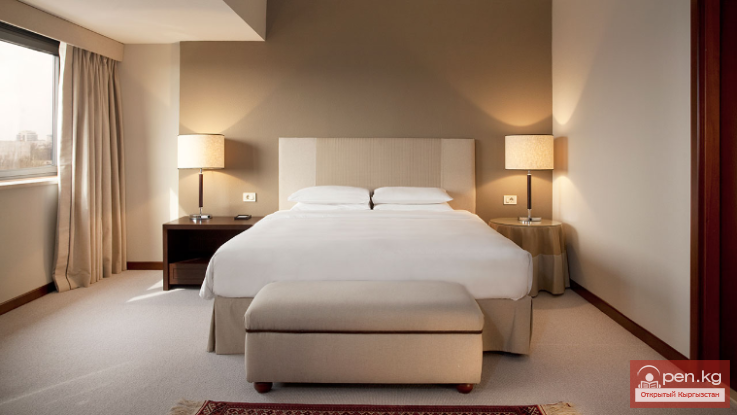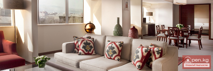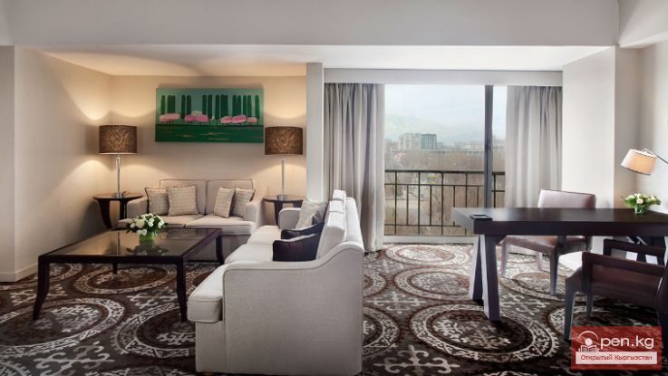 Для комнат на южной стороне отеля открывается прекрасный вид на горы Ала-Тоо и здание Театра Оперы и Балета. Дневной свет в комнатах особенно подчеркивает тонкости современного городского декора с применением дуба и богатой текстуры. Просторная комната этой категории, размером 96 кв. метров, предлагает жилую и столовую комнату, кухню, эргономичное рабочее место с высокоскоростным Интернетом, две ванные комнаты, а также кровать королевского размера с итальянским постельным бельем из 100% хлопка и подушками на гусином пуху. Включены все услуги Ридженси Клуба, в распоряжении и по требованию гостя можно забронировать соседний связующий номер Полулюкс.