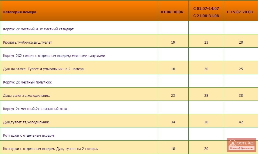 5-этажный корпус гостиничного типа, номера "стандарт" 2-3-местные с видом на озеро для наших туристов на 1-этаже. В каждом номере санузел и раковина с холодной водой, душ с горячей водой общий, находится на 2 этаже корпуса. Номера секционного типа 2-местный+2-местный на 5 этаже (санузел и раковина с холодной водой на 2 номера), с видом на горы. Душ с горячей водой общий, находится на 4 этаже. Номера "улучшенные" 2-3-местные на 3 этаже корпуса, по запросу. В номере отдельный санузел: душ с горячей водой, раковина и туалет, а также телевизор и холодильник. Питание не включено в стоимость, оплачивается отдельно туристом по приезду в пансионат (либо в столовой, либо в кафе).